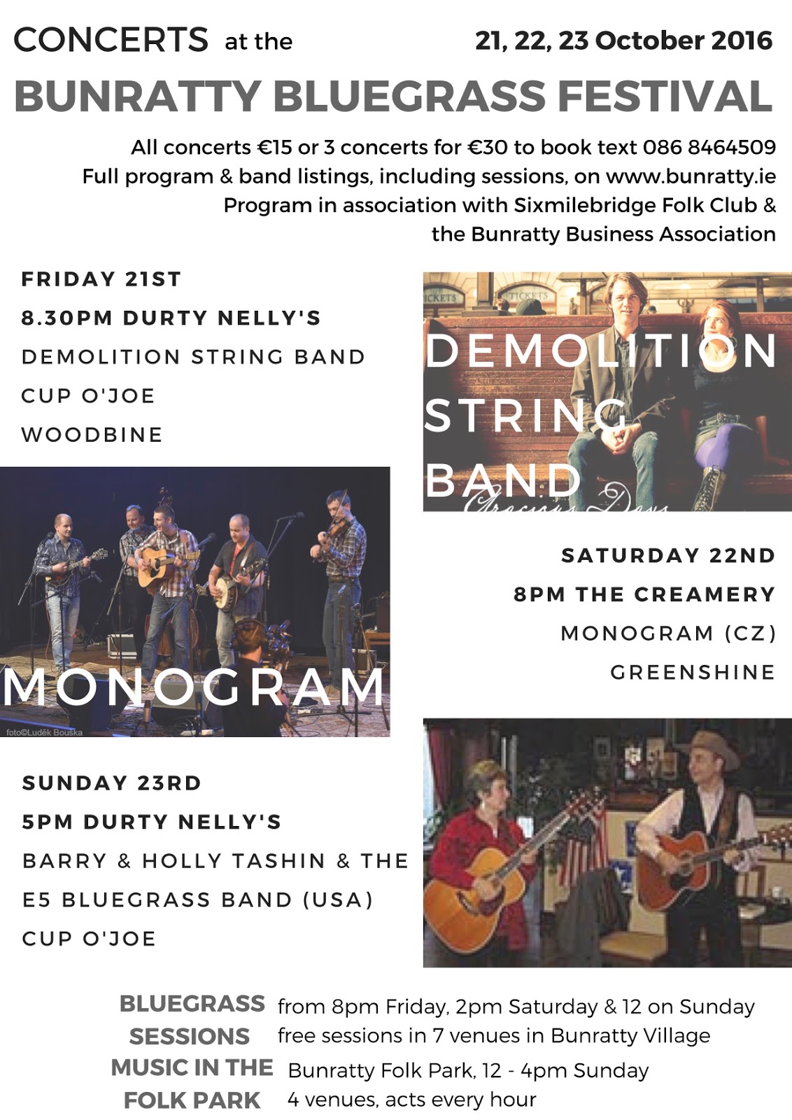 Sun. 23rd: Bunratty Bluegrass Festival, Bunratty, Co. Clare, 3.00 p.m.; 087 7921771